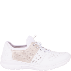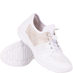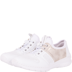 Sneakersy damskie Rieker L3254-80 w klasycznym białym kolorze ze złotymi akcentami to idealne połączenie stylu, wygody i funkcjonalności. Model został zaprojektowany z myślą o kobietach prowadzących aktywny tryb życia.